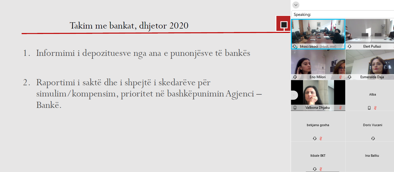 Në kuadër të takimeve periodike që Agjencia organizon me bankat anëtare të skemës të sigurimit të depozitave, në datë 16 dhjetor 2020, Agjencia zhvilloi takimin e rradhës, me përfaqësues të të gjithë bankave. Ky takim kishte për qëllim vijimin e trajnimit të punonjësve të bankave, të cilët janë në kontakt me klientelën, si përcjellësit e parë dhe më të rëndësishëm të informacionit për sigurimin dhe kompensimin e depozitave.